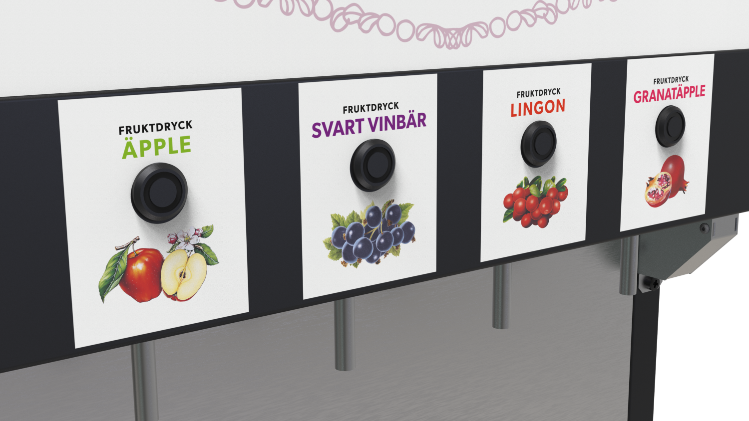 Utrustad med fyra utgångar för att kunna erbjuda tre fruktdrycker och vatten.